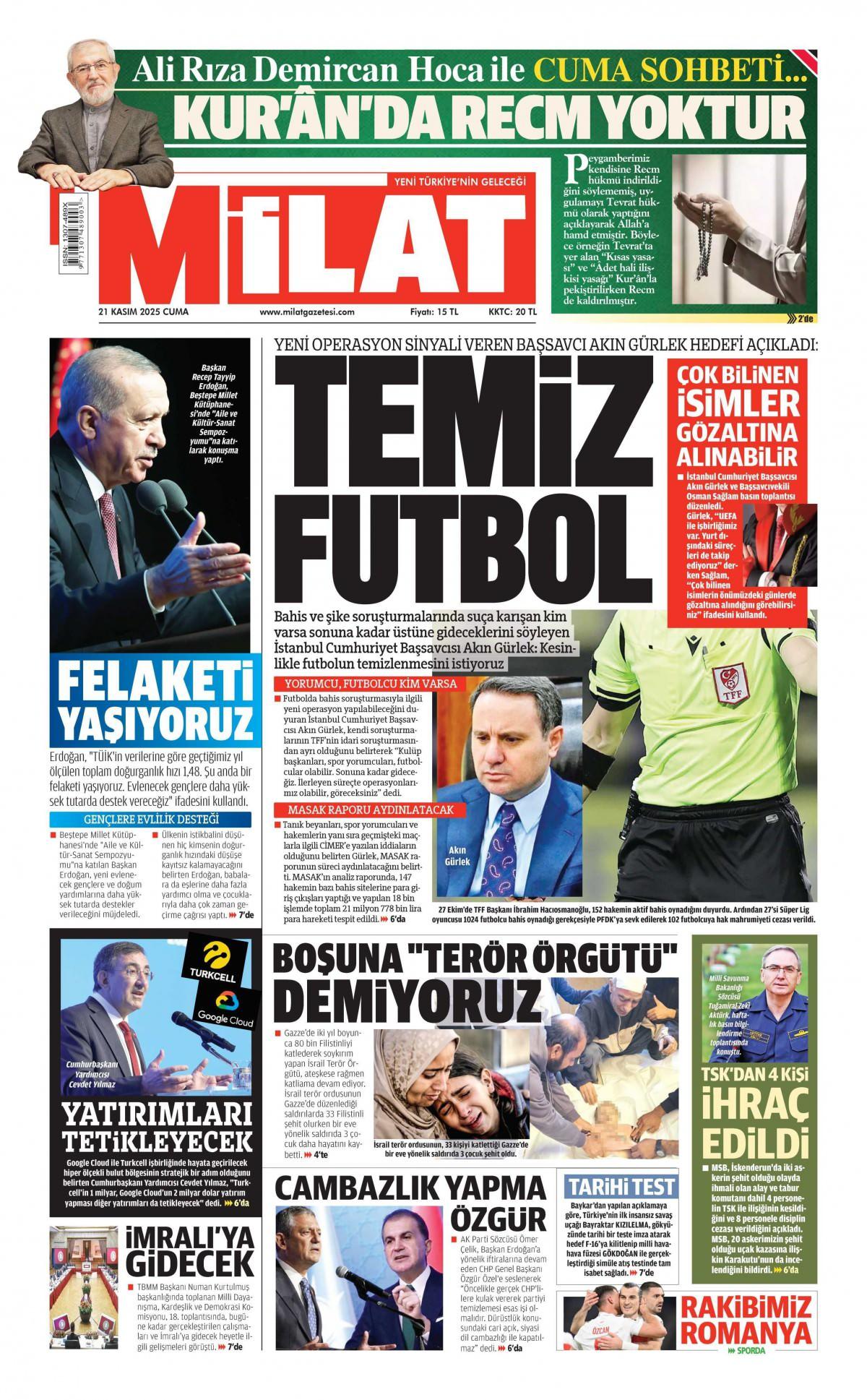 Milat Gazetesi 22 Kasım 2025 Günü Manşeti