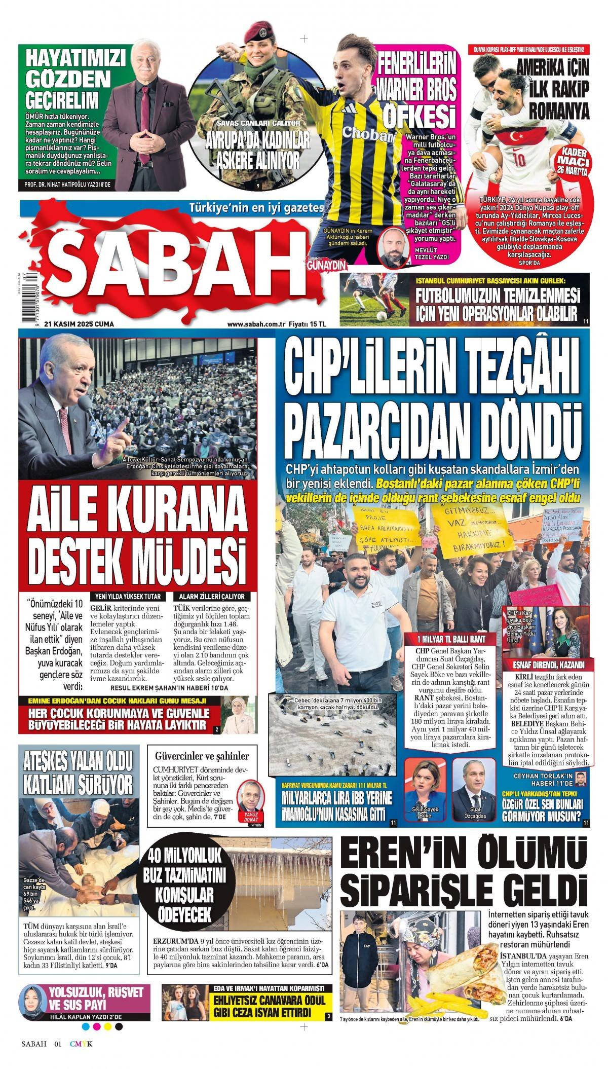 Sabah Gazetesi 22 Kasım 2025 Günü Manşeti