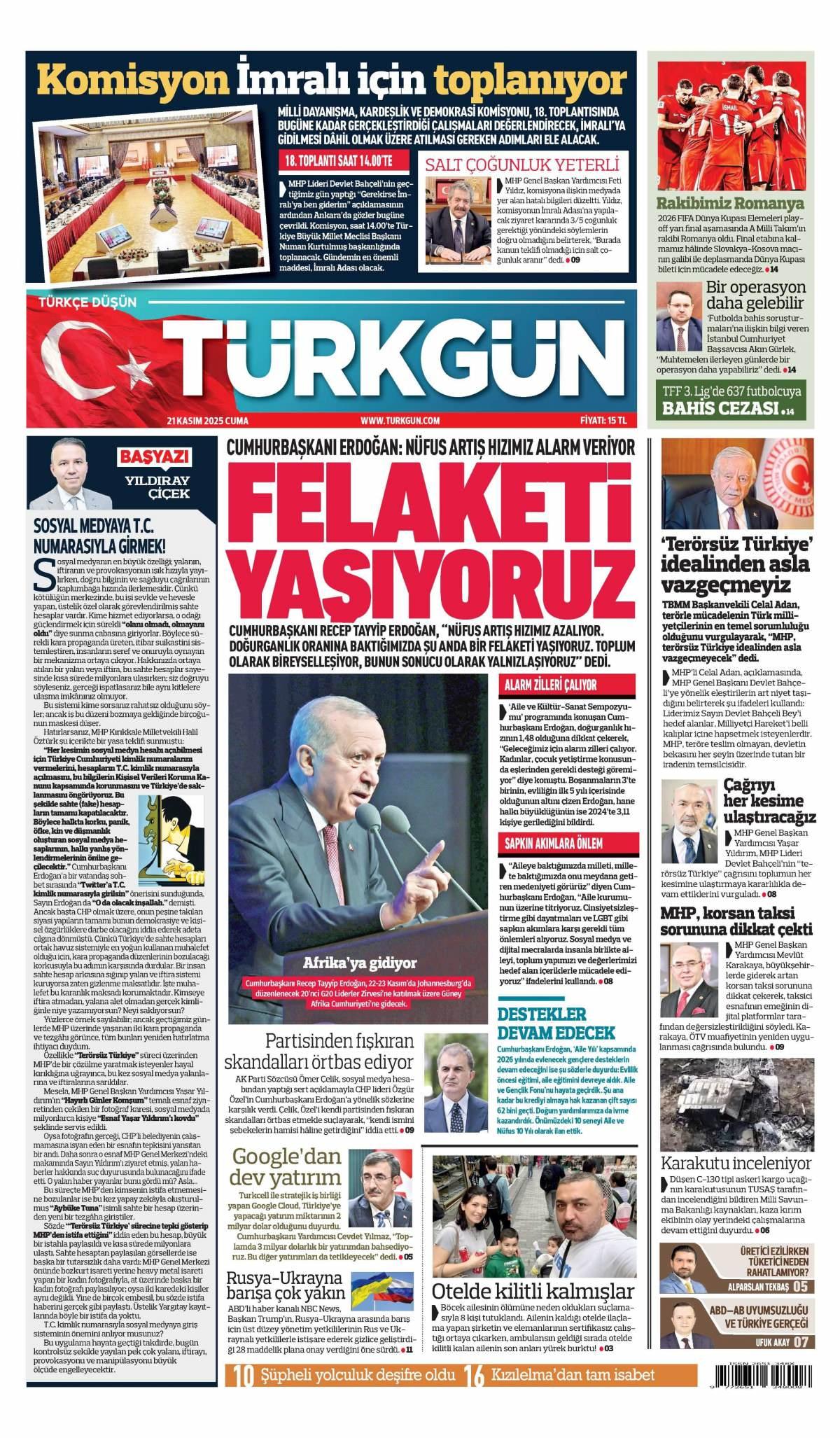 Türkgün Gazetesi 22 Kasım 2025 Günü Manşeti